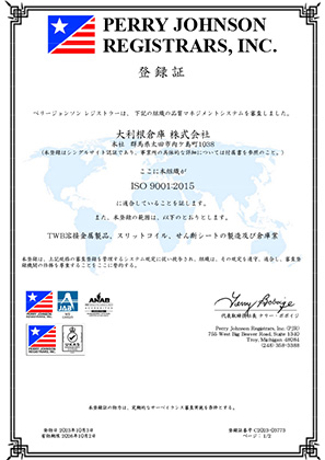 ISO 9001:2015(品質マネジメントシステム)の認証を取得しております。